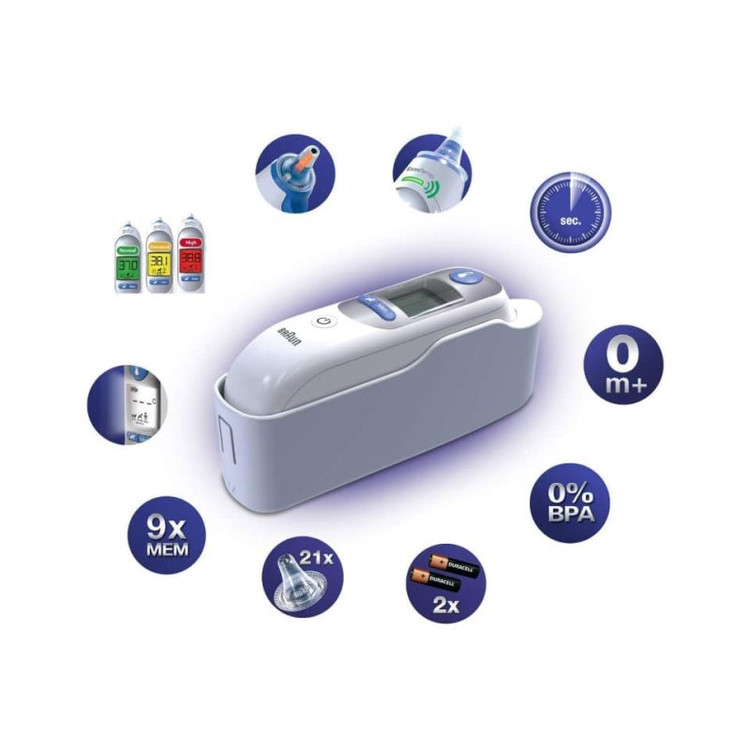 خوانش دما این یک دماسنج سانتیگراد و فارنهایت است. همچنین دارای فناوری مادون قرمز است که دما را در چند ثانیه می گیرد و ملایم است، بنابراین یک انتخاب عالی برای کل خانواده است. سیستم ExactTemp از نور و بوق برای تأیید موقعیت مناسب استفاده می کند، بنابراین می توانید مطمئن باشید که درست استفاده می شود. از آن به عنوان یک دماسنج دیجیتالی گوش کودک، برای کودکان نوپا و کودکان و حتی به عنوان یک دماسنج بزرگسالان استفاده کنید. فیلترهای لنز یکبار مصرف بهداشتی به اشتراک گذاشته می شوند. بر اساس یک نظرسنجی مشاوره ای Ardent که گزارش می دهد از میان پزشکان اطفال مورد بررسی که یک مارک دماسنج را به بیماران خود توصیه می کنند، Braun بهترین مارک توصیه شده است. با دماسنج دیجیتالی Braun ThermoScan 7 نتایج سریع و قابل اعتماد دریافت کنید. این دماسنج گوش از فناوری Age Precision برای هدایت تب با سن قابل تنظیم و نمایشگر رنگی برای تفسیر آسان نتایج استفاده می کند.براون برند دماسنج گوش است که بیشتر توسط پزشکان اطفال توصیه می شود. این دماسنج دارای فناوری مادون قرمز است که دما را در چند ثانیه اندازه گیری می کند و سیستم ExactTemp از نور و بوق برای تأیید موقعیت مناسب استفاده می کند. می توان از آن به عنوان دماسنج کودکان و نوزادان و به عنوان دماسنج بزرگسالان استفاده کرد. این فقط یک دماسنج کودک نیست، این دماسنج مادون قرمز ملایم را می توان برای کل خانواده استفاده کرد. پوشش های دماسنج گوش یکبار مصرف / فیلترهای لنز اشتراک گذاری را بهداشتی می کند. پزشکان اطفال به دماسنج دیجیتال، پیشانی و بدون تماس Braun اعتماد دارند و شما هم می توانید.