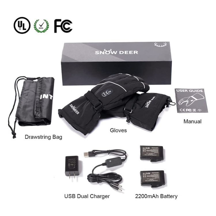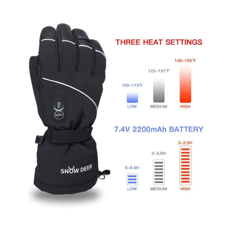 دستکش های گرمایش برقی Snowdeer دارای سه تنظیم حرارتی (بالا، متوسط و کم) هستند که به شما امکان می دهد دمای مورد نیاز خود را با عملکرد یک کلید تنظیم کنید. دما می تواند تا 150 ℉ (65.5 ℃) در تنظیمات بالا برسد. المنت حرارتی در عرض 30 ثانیه گرمای نواحی گرم کننده پشت دست و نوک انگشتان را فراهم می کند. دستکش های قابل شارژ با گرمکن توسط باتری های لیتیوم پلیمری 7.4 ولتی با گواهی ایمنی CE، ROSH تغذیه می شوند. باتری با ظرفیت 2200 میلی آمپر ساعت می تواند تا 6.5 ساعت دوام بیاورد (تنظیم کم). دستکش های برفی با عملکرد باتری بالا برای اطمینان از گرم نگه داشتن دست ها برای مدت طولانی در خارج از منزل هستند. دستکش ها از باتری قابل شارژ از 60% نایلون و 40% پارچه چرم ساخته شده و ضد باد، ضد آب و تنفس هستند. آستر فلیس به دستان شما لمسی سبک و راحت می دهد. و محفظه باتری از یک زیپ ضد آب استفاده می کند، بنابراین لازم نیست نگران خطرات ناشی از نفوذ آب برف به باتری باشید. PU رسانا در انگشت شست و اشاره به شما امکان می دهد بدون درآوردن دستکش زمستانی خود، تلفن همراه را لمس کنید. دستکشهای حرارتی نه تنها برای افرادی که از گردش خون ضعیف، آرتریت، رینود یا تاندونیت دست رنج میبرند، مفید است، بلکه برای افرادی که در خارج از خانه کار میکنند، مانند برف زدن، حمل و نقل و فرمان ترافیک نیز مفید است. مخصوصاً برای اسکی، اسنوبورد، سورتمه سواری، دوچرخه سواری، و پیاده روی سگ و غیره مناسب است.