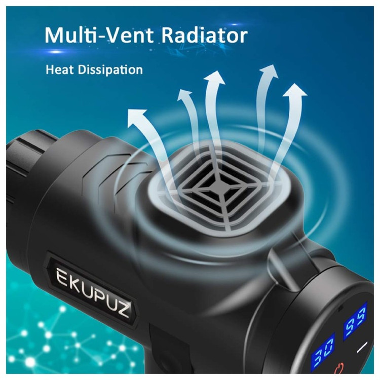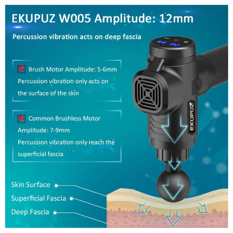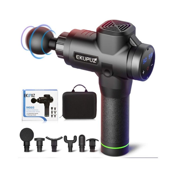 ماساژور تفنگی Ekupuz موتور با گشتاور بالا 1200 تا 3200 بار در دقیقه کار می کند و ماساژ بافت عمقی 12 میلی متری را ارائه می دهد. ماساژور برای تسکین سفتی و درد عضلانی، بهبود گردش خون و لنف استفاده می شود. تفنگ ماساژ دستی 30 سرعت قابل تنظیم برای کاهش درد عضلانی و کمک به شما برای تسریع گردش خون ارائه می دهد. می توانید سرعت راحت را برای ماساژ تسکین درد یا آرامش روزانه خود پس از ورزش انتخاب کنید. تفنگ ماساژ EKUPUZ مجهز به 6 سر ماساژ با شکل های مختلف است. اتصالات مختلف آنها را برای گروه های مختلف عضلانی مناسب می کند و درمان هدفمندی را برای بهبودی سریع ارائه می دهد. شما می توانید با توجه به نیاز بدن خود از این تفنگ ماساژور حرفه ای با سر مناسب استفاده کنید. مجهز به باتری لیتیومی با کیفیت 2400 میلی آمپر ساعتی، تفنگ ماساژ می تواند 4 تا 6 ساعت پس از شارژ کامل کار کند. شما می توانید از ماساژور به راحتی و به وضوح قدرت باتری و سطح سرعت را توسط صفحه نمایش لمسی LCD با گشتاور بالا و موتور الکتریکی بدون برس که عملکرد بالایی را با سر و صدای کم ارائه می دهد، صدای کار تفنگ ماساژ دستی حتی اگر بالاترین سرعت ارتعاش را انتخاب کنید از 35 دسی بل تجاوز نمی کند. وقتی در دفتر یا باشگاه استفاده می شود، دیگران را آزار نمی دهد. دسته ارگونومیک شکل ارتعاشات خارجی را به حداقل می رساند. وزن سبک (فقط 1.89 پوند) و دسته سیلیکونی ضد لغزش بادوام نگهداشتن ماساژور را آسانتر میکند. همراه با یک کیف حمل عملی است که تمام قطعات را در شرایط عالی نگه می دارد و آنها را در هنگام مسافرت قابل حمل تر می کند.