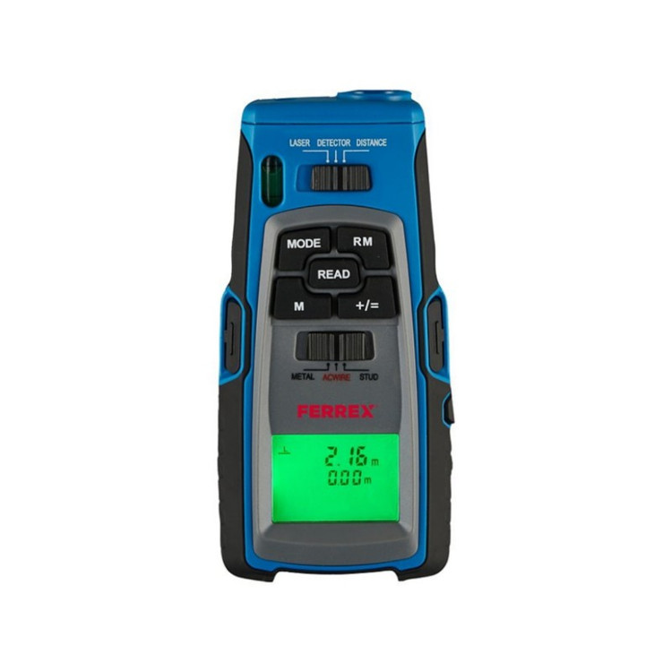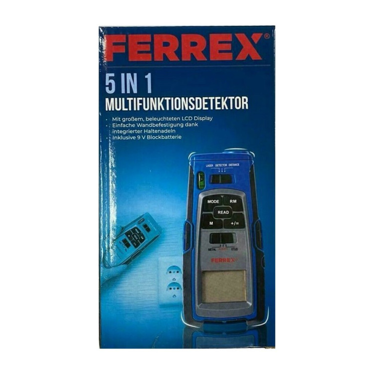 آشکار ساز چندکاره FERREX قابلیت اندازه گیری فاصله و تشخیص سازه های چوبی و فلزی و خطوط برق را دارد.شامل باتری 9 ولت بلوک و 5 عملکرد عملی در یک دستگاه است. نمایان شدن علائم لیزری افقی و عمودی تا فاصله 10 متری، ایده آل برای تراز کردن کمدها یا اتصالات دیواری میباشد.اندازه گیری فاصله با استفاده از اولتراسوند و حافظه یکپارچه برای محاسبه مساحت و حجم است.قدرت تشخیص سازه های چوبی تا عمق تقریبی 38 میلی متر و همچنین تشخیص سازه های فلزی تا حدود 24 میلی مترو تشخیص خطوط برق تا عمق تقریبی 35 میلی متر است.