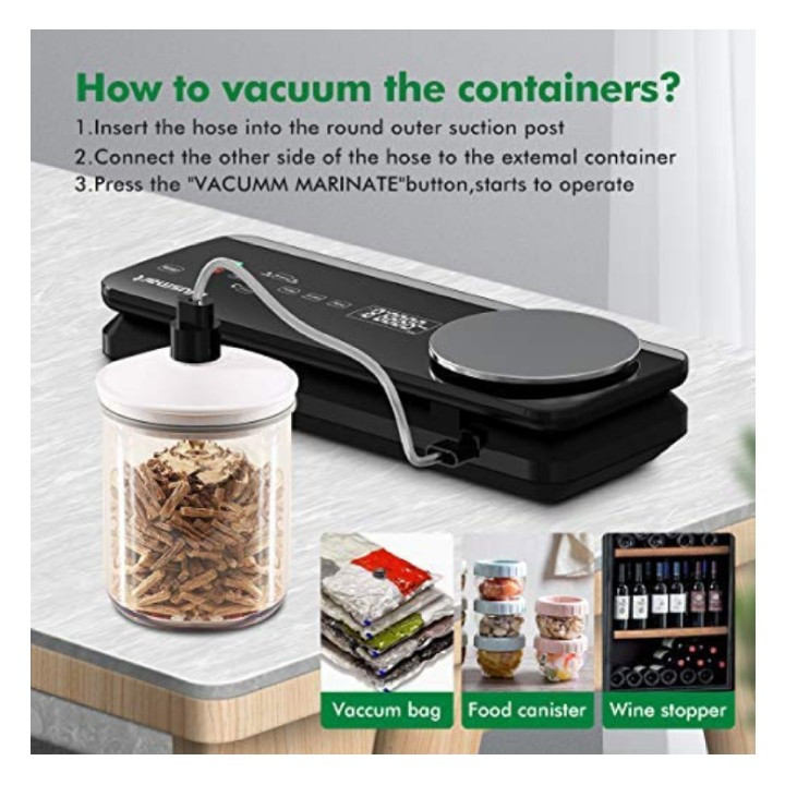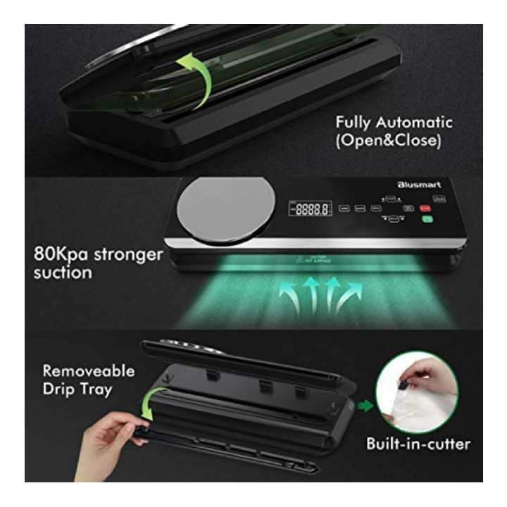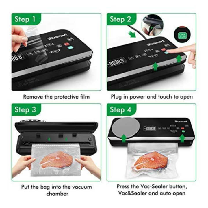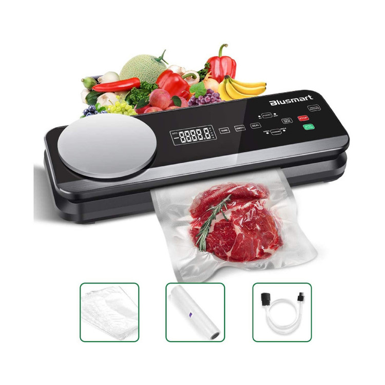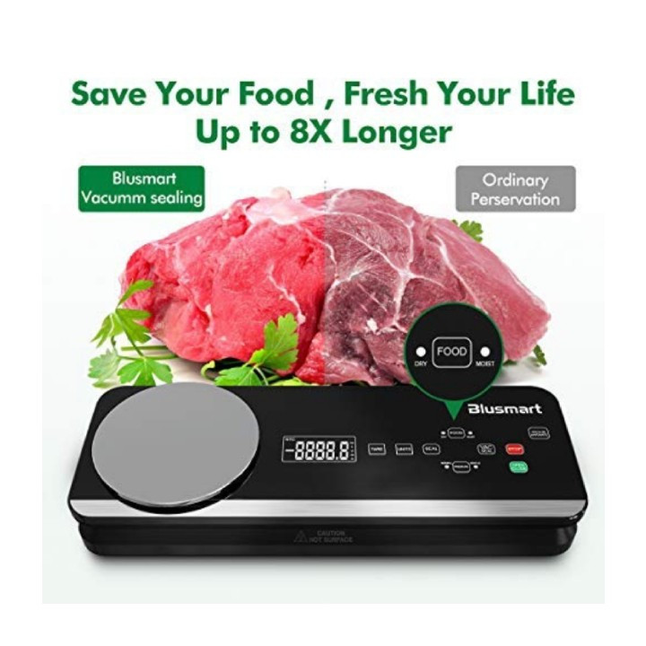 وکیوم سیلر Blusmart با پمپ وکیوم قدرتمند 80 کیلو پاسکال، که می تواند به سرعت هوا را تخلیه و بسته بندی را جمع کند، زمان نگهداری غذا را تا 8 برابر بیشتر از روش های معمولی افزایش می دهد (عمداً بسته به نوع غذا) و همچنان اصل را حفظ می کند. طعم غذا، کاهش بد رفتن، برای جلوگیری از هدر دادن غذا برای صرفه جویی در هزینه، همچنین برای صرفه جویی در وقت خود برای خرید کالا در سوپرمارکت در همان زمان است. این دستگاه سیلر مواد غذایی از چفت قفل خودکار کاملا اتوماتیک طراحی شده با مرکز کنترل قرار گرفته در پانل بالایی و دکمه های دیجیتال لمسی نرم همراه با چراغ های نشانگر LED استفاده می کند. بدون نیاز به فشار دادن درب توسط خودتان، دستگاه پس از مهر و موم کردن کیسه جاروبرقی به طور خودکار باز می شود. یک دستگاه هوشمند طراحی راحت و منحصربهفرد علاوه بر این، این دستگاه سیلر وکیوم با ترازوی دیجیتال آشپزخانه برای پخت بهتر، پخت، ردیابی مصرف می باشد. یک سینی چکه قابل جابجایی میتواند هر مایع سرریزی را که پس از استفاده تمیز و نگهداری میکند، جذب کند. دستگاه سیلر خلاء دارای 4 حالت مفید است: خشک / مرطوب، خلاء معمولی، خلاء نرم، همچنین این سیستم آب بندی خلاء برای نگهداری مواد غذایی می تواند مناسب ترین روش های نگهداری را با توجه به انواع مختلف مواد غذایی، بافت و نیازهای پخت ارائه دهد. برای کنترل بیشتر فشار خلاء مورد نیاز، STOP را فشار دهید. دکمه VACUUM MARINATE را در صورت اتصال به سایر لوازم جانبی جاروبرقی مانند ظرف نگهداری غذا، مربا، درب شراب و غیره فشار دهید.به غیر از سیلر خلاء و شیلنگ مکش هوا، بسته سیلر خلاء همچنین شامل 10 کیسه خلاء متوسط، یک رول کیسه خلاء طولانی و یک ترازو آشپزخانه است.