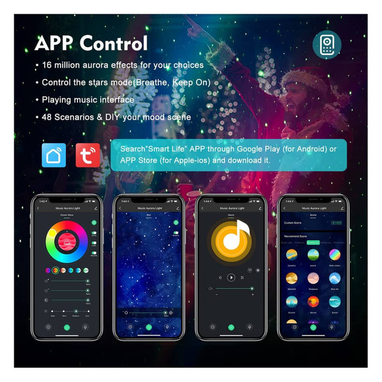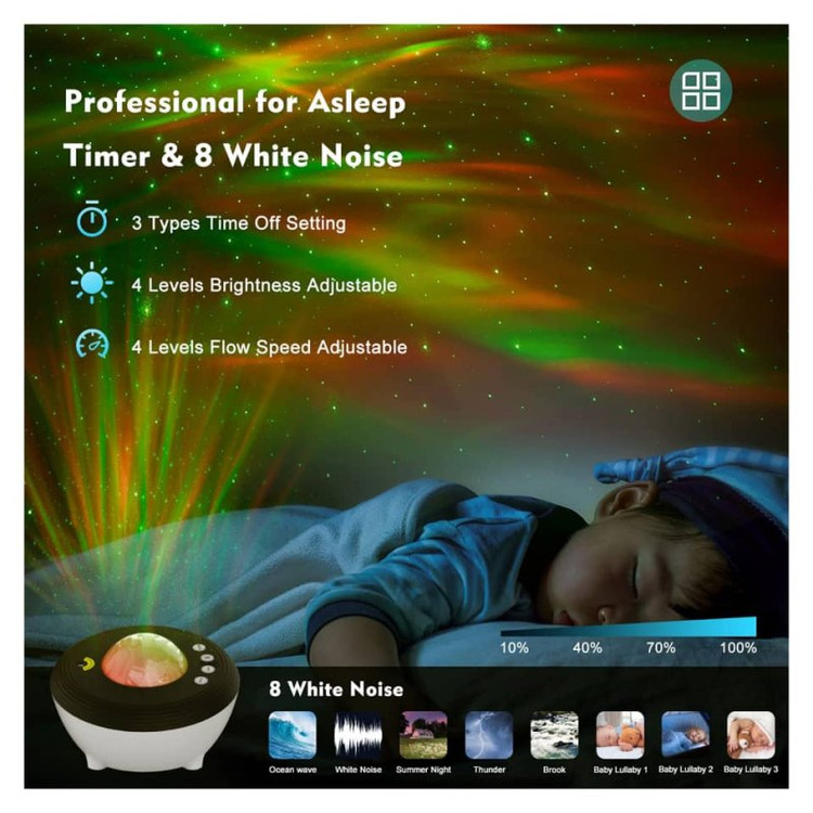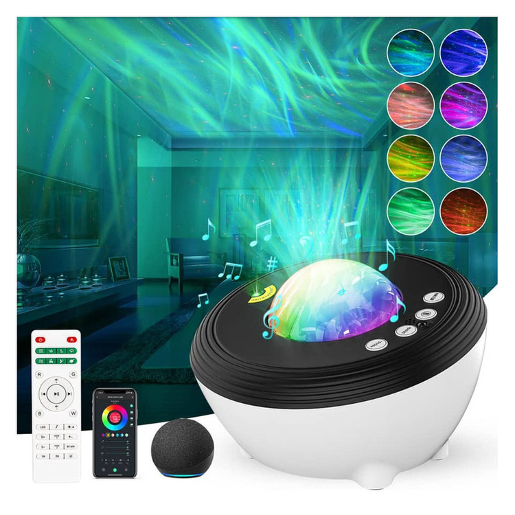 پروژکتور هوشمند آرورا دارای 4 رنگ (قرمز، سبز، آبی، سفید) است که از جلوه های روشنایی جامد، دو رنگ و سه رنگ پشتیبانی می کند و می تواند 11 حالت نورپردازی ایجاد کند. پروژکتور ستاره با ترکیب نورهای چند رنگ و سرعت های مختلف، فضایی رمانتیک ، آرامش بخش و راحت را برای شما به ارمغان می آورد، عملیات پیچیده ای ندارد و برای کودکان و بزرگسالان آسان است. شما می توانید نیازهای خود را از طریق کنترل از راه دور سفارشی کنید. این پروژکتور ستاره دار دارای یک بلندگوی داخلی موسیقی است که در عرض چند ثانیه از طریق بلوتوث به گوشی هوشمند متصل می شود. از موسیقی مورد علاقه خود در فضای رمانتیک و ستاره ها لذت ببرید. دارای 8 نوع نویز موسیقی آرامش بخش، قورباغه، موج، پرنده، باران، لالایی، آب جاری و آتش کمپ. با پروژکتور نور شب می توانید آرامش داشته باشید و از یک زندگی خوب لذت ببرید.