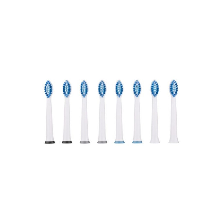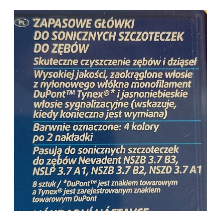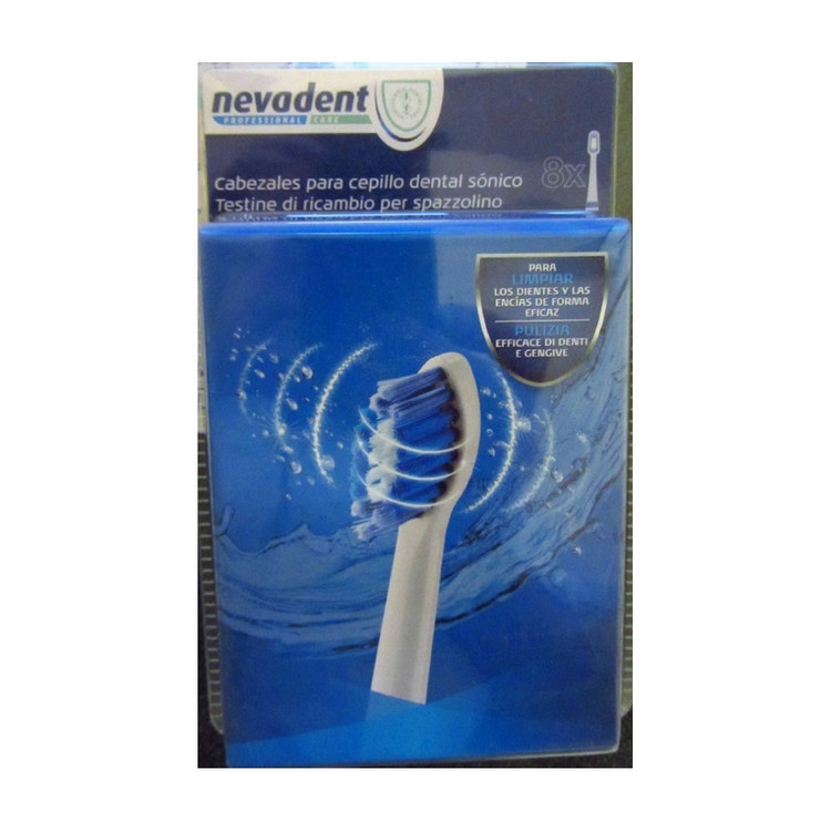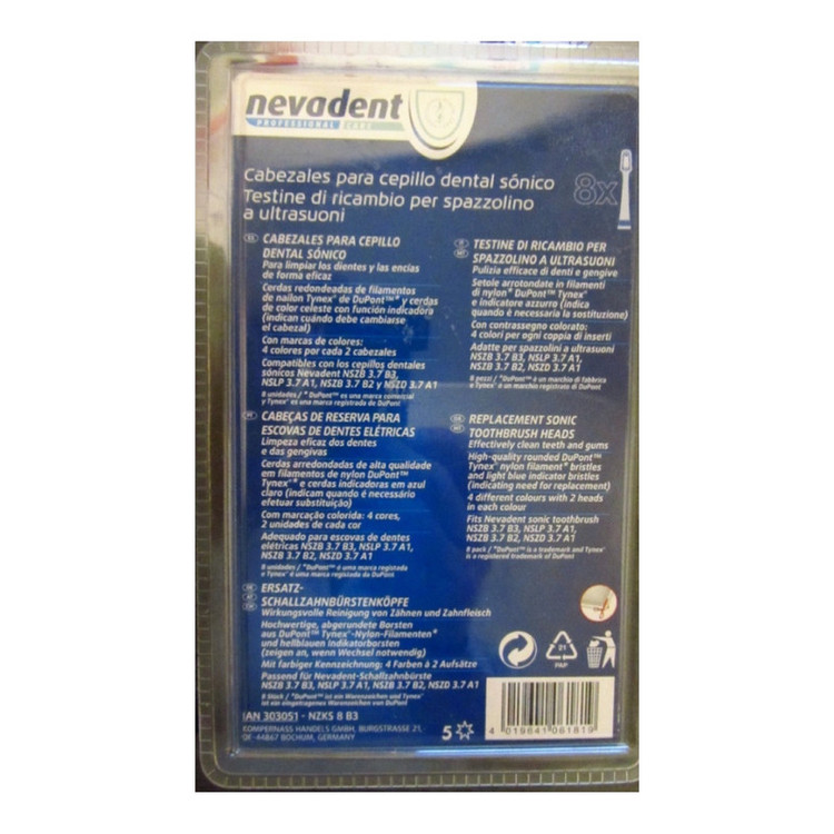 سر مسواک جایگزین NEVADENT® Sonic 8er ، تمیز کردن موثر دندان ها و لثه ها موهای با کیفیت بالا و گرد ساخته شده از رشته های نایلونی DuPont™ Tynex®x و موهای نشانگر آبی روشن (در صورت لزوم تغییر نشان داده شود) مناسب برای مسواک صوتی Nevadent NSZB 3.7 B3، NSLP 3.7 A1، NSZB 3.7 B2، NSZD 3.7 A1 میباشد.