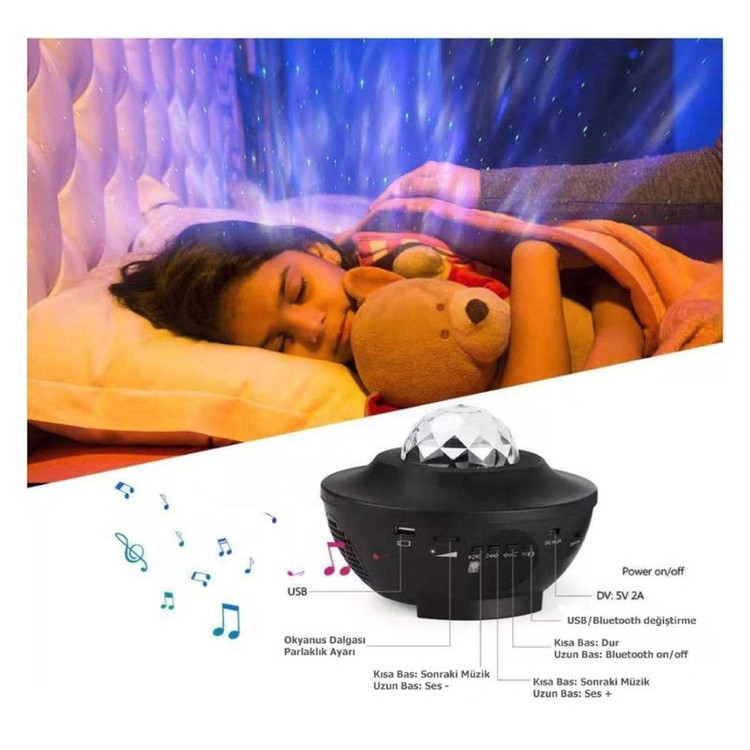 پروژکتور ستاره ای هوشمند یک تصویر سحابی از تغییر ستاره های رنگارنگ روی دیوار یا سقف خانه شما ایجاد می کند.(60W-4W RMS) با اتصال بلوتوث گوشی خود به پروژکتور ستاره دار. با گوش دادن به موسیقی لالایی، آرامش بخش و موسیقی مراقبه، شبی حماسی در مهمانی خود به دوستان خود هدیه دهید.10 حالت مختلف نورپردازی امواج اقیانوس را با رنگ های آبی، قرمز، سبز و سفید ایجاد می کند. این یک تجربه فضای راحت، رمانتیک و رنگارنگ با توجه به ترجیح شما فراهم می کند. در صورت تمایل می توانید رنگ های تک رنگ یا ترکیبی را انتخاب کنید. در حالی که در حالت نمایش هستید، پروژکتور ستاره ای به شما احساس ماندن در وسط دریا یا مانند یک مسافر فضایی بین ستاره ای را می دهد.کنترل از راه دور پروژکتور ستاره ای، می توانید امواج اقیانوس و نور ستاره را از راه دور کنترل کنید، 4 سطح روشنایی را تنظیم کنید، حالت نور را تغییر دهید. علاوه بر این، سرعت، حالت موسیقی، تنظیم صدا در دستان شما خواهد بود. با تایمر خاموش داخلی خود خاموش می شود. در مهد کودک و اتاق خواب اصلی بسیار مفید است. پروژکتور ستاره ای کاملاً در هر دکوراسیون محیطی مناسب است تا تجربه ای دلپذیر و آرامش بخش قبل از خواب برای کودکان فراهم کند و کودکان را تسکین و آرامش دهد. مناسب برای سالن رقص، دیسکو، جشن تولد، باشگاه، گردهمایی خانوادگی و غیره. فضای متفاوتی به محیط آنها می بخشد. همچنین یک هدیه خوب برای دوستان، خانواده ها در تمام فصول سال خواهد بود.