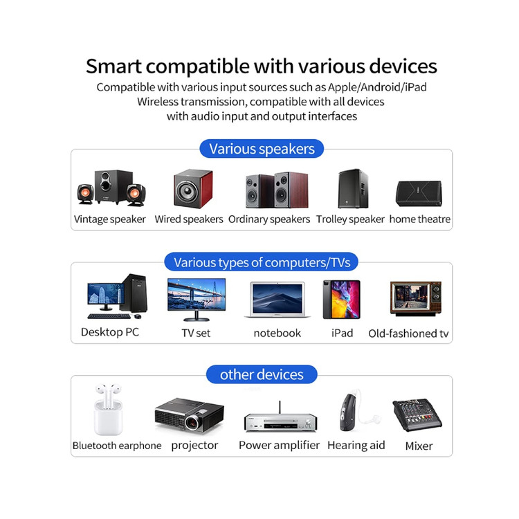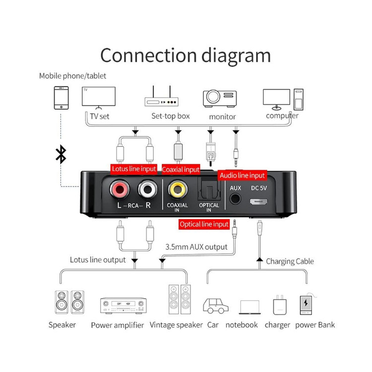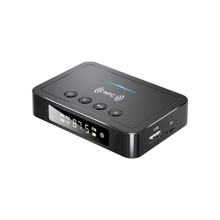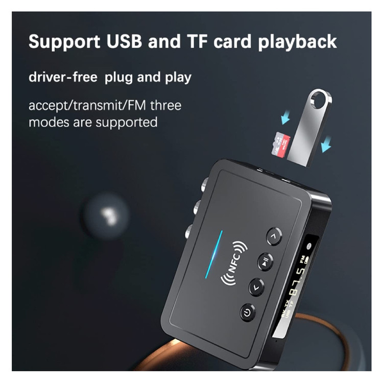 گیرنده بلوتوث فرستنده FM 3-in-1: ارتقاء بلوتوث 5.0 اتصال لمسی NFC دوم، رابط غنی، سازگار با AUX / RCA، رابط دیجیتال نوری/کواکسیال/USB/TF، عملکرد قدرتمند، تبدیل دستگاه های سیمی به عملکرد بلوتوث در ثانیه، 5 کنترل از راه دور تا 10 متر NFC Bluetooth 5.0، لمس و اتصال: گیرنده بلوتوث NFC. تراشه سنسور بلوتوث داخلی، تلفن همراه در نزدیکی ناحیه حسگر NFC قرار دارد تا در چند ثانیه به آن متصل شود و اتصال دستی خسته کننده با بلوتوث را کاهش دهد. 【رابط غنی】: آداپتور بلوتوث دیجیتال به آنالوگ داخلی، به راحتی از دستگاه های صوتی نوری دیجیتال AUX / RCA / دیجیتال، رابط کواکسیال، وصل و پخش پشتیبانی می کند. کیفیت صدای با کیفیت بالا، بدون تاخیر: بلوتوث NFC سازگار، آنتن سرامیکی داخلی و تقویت کننده سیگنال، کیفیت صدای انتقال 10 متر بدون تاخیر، پایداری سیگنال بدون پارازیت، بدون درایو، وصل و پخش سازگاری قوی: فرستنده بلوتوث NFC با منابع سیگنال ورودی مختلف مانند گوشی های هوشمند و تبلت ها، اسپیکرهای مختلف، کامپیوتر و غیره سازگار است و همچنین برای هدست بلوتوث، پروژکتور، تقویت کننده های قدرت، سمعک و میکسر مناسب است.
