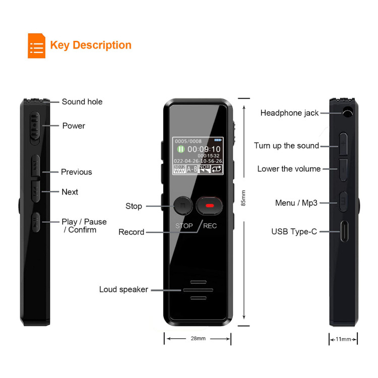ضبط کننده صدا/voice recorder دبجیتالی Tschisen شفاف با نرخ بیت 3072Kbps از طریق دو میکروفون حرفه ای کاهش نویز پویا، انتخاب های مختلف نرخ بیت، کیفیت ضبط بالاتر، فرمت های صوتی متعدد. همچنین می توان از آن به عنوان پخش کننده MP3 قابل حمل استفاده کرد.پشتیبانی از ضبط فعال صدا، هنگامی که صدا ظاهر می شود به طور خودکار ضبط می کند. هنگامی که هیچ صدایی شناسایی نمی شود، برای صرفه جویی در ظرفیت ضبط و کاهش مصرف انرژی، در حالت آماده به کار می ماند. فاصله ضبط می تواند تا 65 فوت برسد. ضبط دقیق و کیفیت صدای بهبود یافته را از طریق دو میکروفون مستقل کاهش نویز ارائه دهید. پشتیبانی از ضبط خودکار با زمان از پیش تعیین شده پشتیبانی از عملیات تک لمسی، به راحتی با دکمه "REC"/"Stop" ضبط/ذخیره کنید. پشتیبانی از عملکرد تکرار A-B، ضبط پخش را در بازه زمانی مشخصی فعال می کند. پشتیبانی از پخش در حرکت آهسته یا سریع با سطوح مختلف. پشتیبانی سریع به جلو و عقب در حین پخش، برای بررسی سریع درس ها، کنفرانس ها، مصاحبه ها، مکالمات و غیره مفید است.ساختار کوچک آلیاژ روی بادوام به آن اجازه می دهد در برخی موارد خاص مورد توجه قرار نگیرد. یک حافظه 8 گیگابایتی برای اکثر سناریوهای روزانه مناسب است. پشتیبانی از 25 زبان مختلف این ضبط کننده همچنین دارای یک کابل USB نوع C و یک کتاب دستی برای کمک به آشنایی سریع با عملیات است. این یک هدیه ایده آل برای دانش آموزان، وبلاگ نویسان، نویسندگان، روزنامه نگاران و تجار است.
