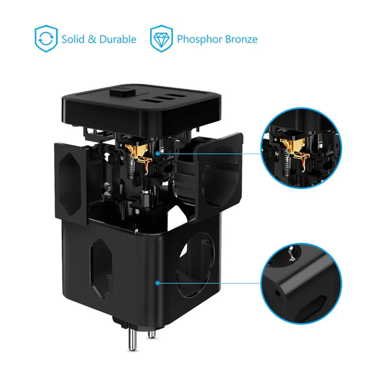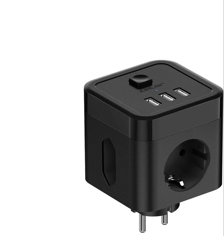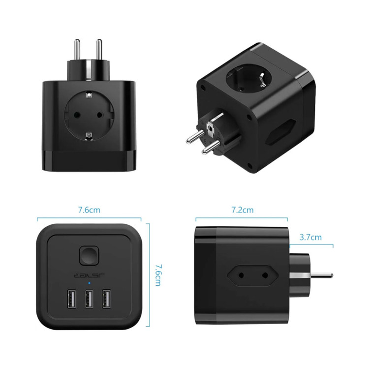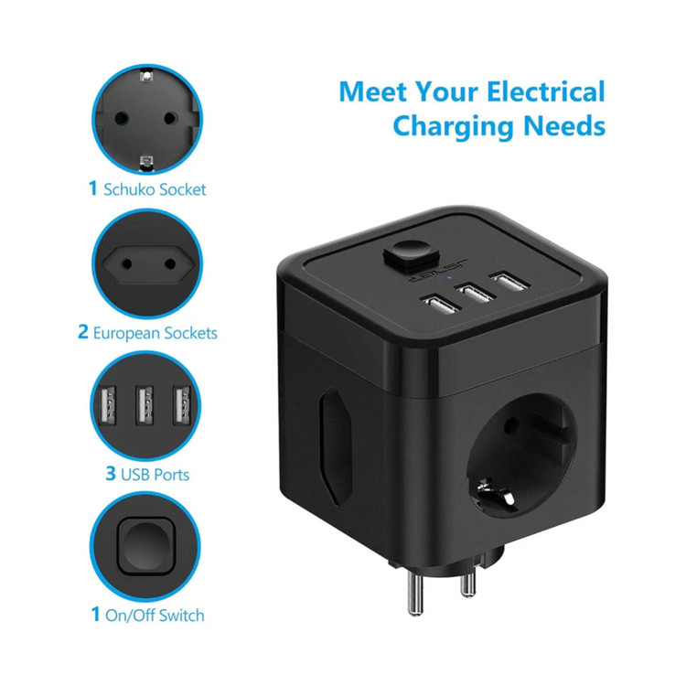 منبع تغذیه USB مکعبی شکل JSVER، 3 سوکت، آداپتور با چندین سوکت (2 سوکت یورو + 1 سوکت محافظ)، محافظ دوشاخه، 3 سوکت USB، سوئیچ، برای دفتر، منزل یا مسافرت، مشکی