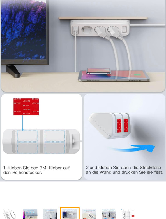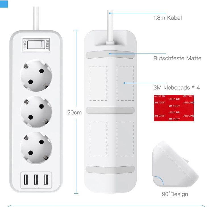نوار سوکت سه طرفه SUDEERY با 3 USB، سوکت توزیع کننده چند منظوره، سوکت گوشه با سوئیچ، سوکت چندگانه، محافظ اضافه بار با کابل افزودنی 1.8 متری برای آشپزخانه، سفید
