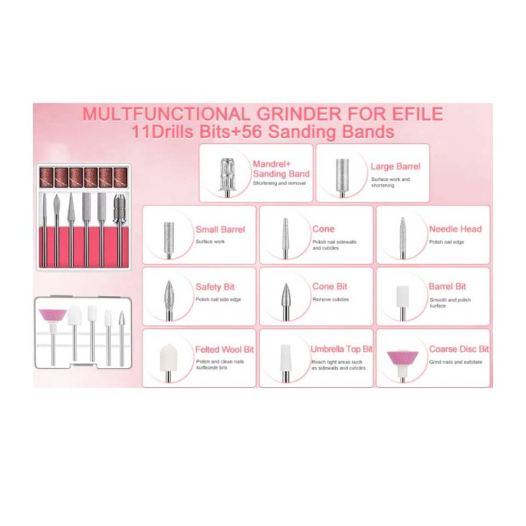 1 عدد کنترلر قدرت 1 عدد قلم مته ناخن 11 عدد مته 36 x نوار سنباده 1 عدد جا قلمی دریل ناخن 1 عدد آداپتور برق متناوب 1 عدد کابل DC 1 x دفترچه راهنمای کاربر