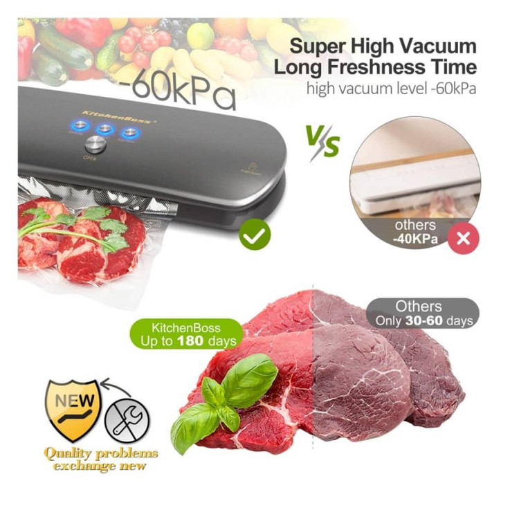 دستگاه بسته بندی غذا با خلاء تمام اتوماتیک KitchenBoss می تواند غذا را 8 برابر بیشتر مرطوب و خشک نگه دارد. برای انواع مختلف غذا مانند گوشت، ماهی، سبزیجات، میوه ها، آجیل، کوکی ها، ادویه جات و غیره مناسب است. به لطف پمپ خلاء بسیار موثر و موتور با کارایی بالا، درزگیر نیروی مکش تا -60 کیلو پاسکال را ایجاد می کند. دیگر هوا در کیسه وجود ندارد و غذا را تازه نگه می دارد. حالت 1 برای غذاهای نرم مانند نان ،حالت 2 برای غذاهای خشک، مانند لوبیا، گوشت منجمد (بدون مایع بیش از حد)است. پنبه آب بندی مقاوم در برابر درجه حرارت بالا و بسیار الاستیک برای جلوگیری از آب بندی ناقص بسیار بد است که منجر به خراب شدن خلاء می شود.مجهز به یک شلنگ خلاء برای مکیدن است که می تواند همراه با یک مخزن خلاء برای دربندی و نگهداری آب نبات و غیره استفاده شود. همچنین می توان آن را با یک درپوش شراب خلاء ترکیب کرد تا شراب قرمز را ببندد و حفظ کند. طراحی قفل دوگانه، علائم فشار به پایین را در هر دو طرف به شدت فشار دهید تا در هنگام استفاده هر دو طرف درب قفل شود، که به جاروبرقی و آب بندی کامل کمک می کند.پایین دستگاه مجهز به یک شیار ذخیره سازی سیم است، به هم ریختگی کابل ها را کاهش داده و فضای ذخیره سازی خود را مرتب تر نگه می دارد. پوسته G200 این محصول از مواد ABS + PC V0 ساخته شده است، با کیفیت و مقاوم در برابر آتش است. سطح پوسته صاف و روکش شده است، هرگز محو نمی شود.اگر بستهکننده خلاء خانگی تمام هوا را پس از آببندی خارج کند، پس از آببندی مجدداً پمپاژ تشخیص داده میشود تا اطمینان حاصل شود که دهانه بستهکننده کاملاً استاندارد است.